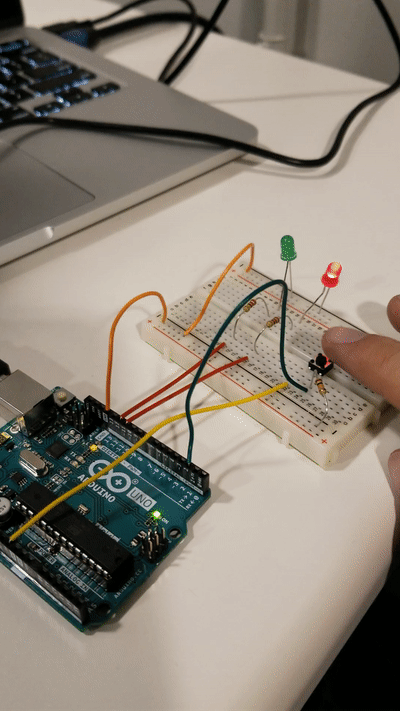 - But if the button is pushed, the green light turns on and the red light turns off.